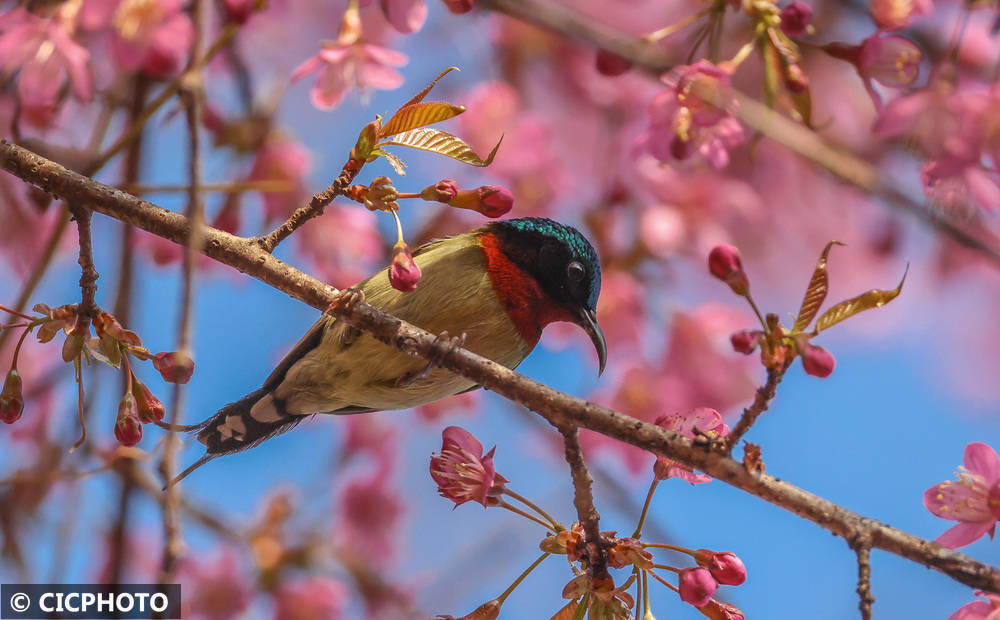 ↑2026年1月8日,一只叉尾太阳鸟在重庆市巫山县办事诠释中心校园内的冬樱花枝端停歇。CICPHOTO/冯光伦 摄