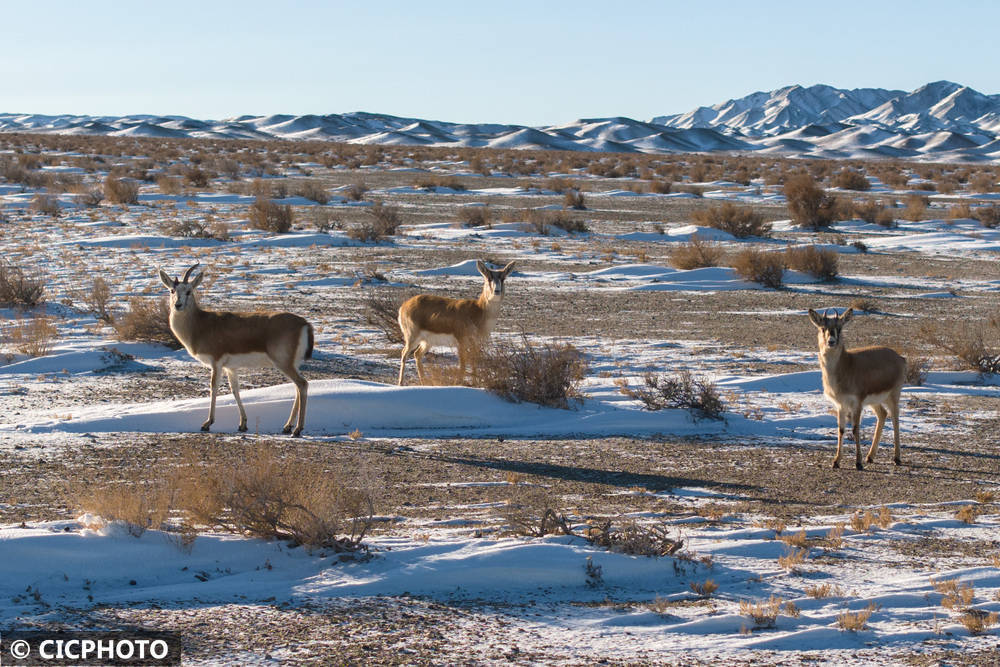 ↑2025年12月23日在新疆巴里坤县西北部的戈壁滩拍摄的鹅喉羚。CICPHOTO/钟卫亮 摄