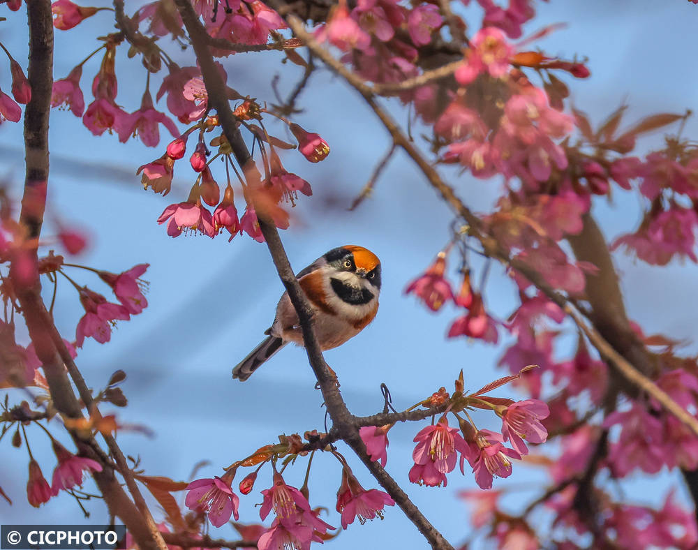 ↑2026年1月8日,一只红头长尾山雀在重庆市巫山县办事诠释中心校园内的冬樱花枝端停歇。CICPHOTO/冯光伦 摄