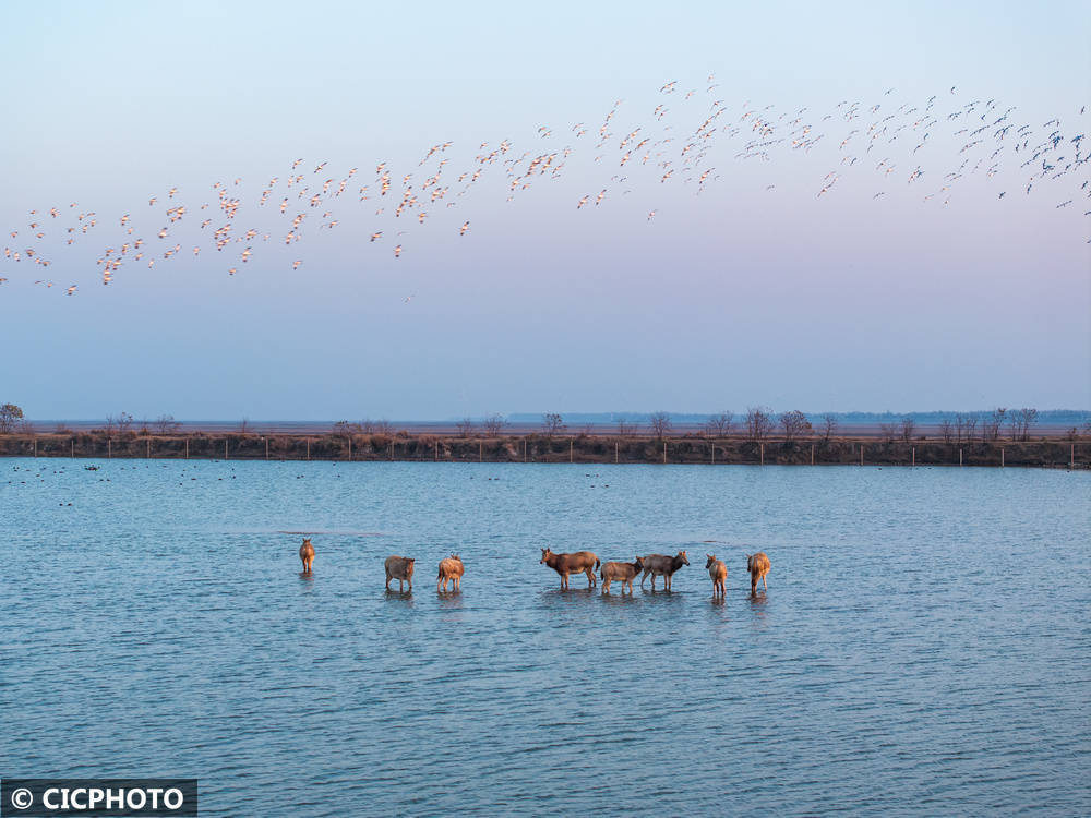 ↑2025年12月6日在江苏省盐城市大丰区黄海野鹿荡拍摄的麋鹿和候鸟。CICPHOTO/胡志超 摄