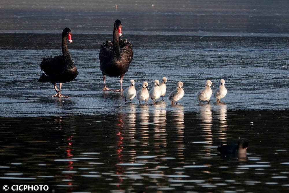 ↑2026年1月5日在河北省邯郸市鸡泽县诗经文化园天鹅湖拍摄的黑天鹅。CICPHOTO/金书怀 摄