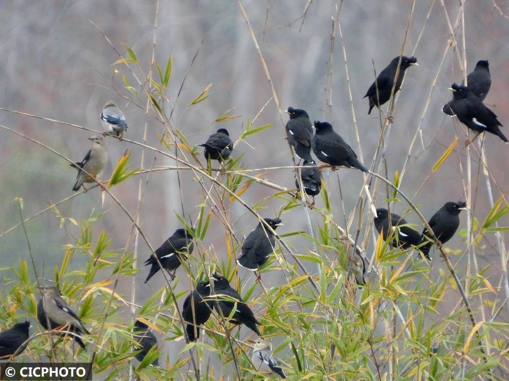 ↑2025年12月22日,丝光椋鸟和八哥在江西省抚州市金溪县陈坊积乡城湖村河滨林间栖息。CICPHOTO/邓兴东 摄