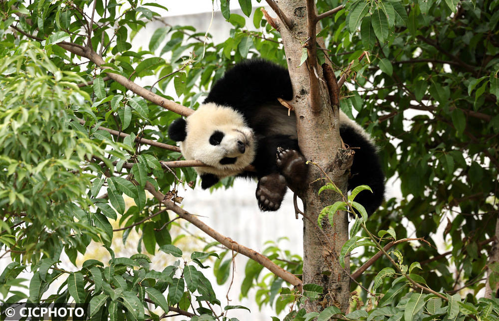 ↑2025年12月13日,一只大熊猫在成齐大熊猫繁育商讨基地的树上休眠。CICPHOTO/姚永亮 摄