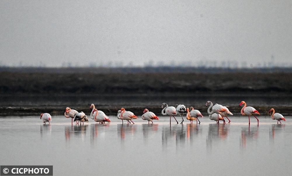 ↑2026年1月3日,火烈鸟在江苏东台便条泥湿地栖息。CICPHOTO/孙家录 摄