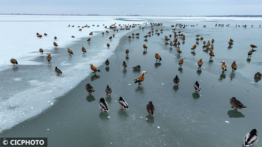 ↑2025年12月21日,赤麻鸭和绿头鸭在甘肃省酒泉市金塔县摆脱村水库栖息。(无东说念主机相片)CICPHOTO/曹红祖 摄