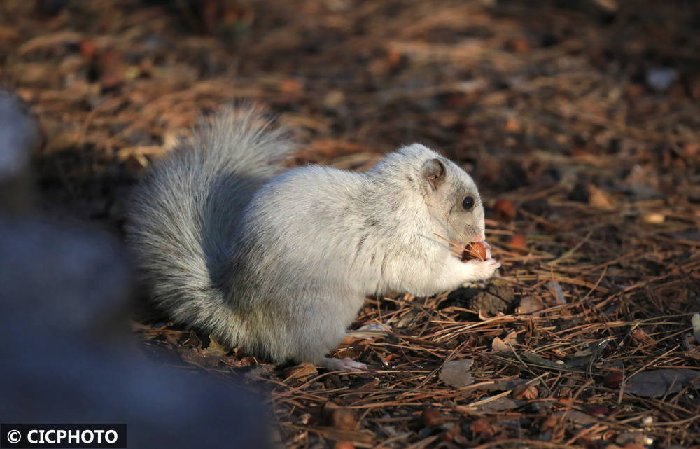 ↑2026年1月8日,一只白色松鼠在辽宁省沈阳市北陵公园内觅食。CICPHOTO/黄金崑 摄
